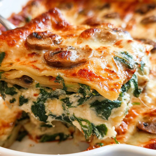 This lasagna is creamy, tender, and deeply satisfying. The mushrooms provide a hearty bite, the spinach adds freshness, and the cheeses melt together into rich, comforting layers. Each slice holds its shape while remaining soft and luscious.