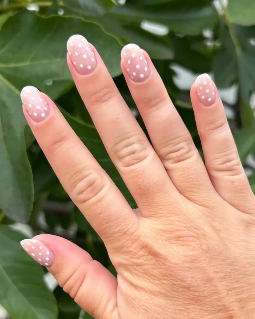 Glazed pink nails with evenly spaced white dots, à la Hailey Bieber and Sabrina Carpenter